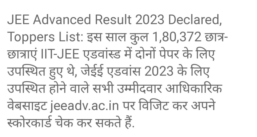 आईआईटी जेईई एडवांस्ड 2023 में क्वालीफाई हुए उम्मीदवार अब देशभर के इंजीनियरिंग कॉलेजों में रैंक और स्कोर के आधार पर एडमिशन ले सकेंगे. छात्र नीचे बताए गए स्टेप्स की मदद से अपना रिजल्ट चेक कर सकेंगे. बता दें कि ज्वॉइंस सीट अलॉटमेंट प्रोसेस (JoSAA) प्रोसेस 19 जून से शुरू होगा.परीक्षा में उपस्थि हुए छात्र आईआईटी जेईई एडवांस्ड की आधिकारिक वेबसाइट jeeadv.ac.in पर जाकर अपना रिजल्ट चेक कर सकते हैं.जेईई एडवांस्ड की परीक्षा में अच्छा स्कोर करने वाले अभ्यर्थियों को आईआईटी और एनआईटी में प्रवेश दिया जाएगा। रिजल्ट चेक करने के लिए अभ्यर्थियों को रोल नंबर, रजिस्ट्रेशन नंबर सहित अन्य डिटेल्स की जरूरत पड़ेगी।