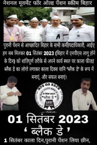 पटना(30.08.2023):- एनएमओपीएस (पुरानी पेंशन प्रतिबद्ध संगठन) की बिहार इकाई द्वारा बिहार में एनपीएस लागू होने के दिन 1 सितंबर को काला दिवस के रूप में मनाया जाएगा और उस दिन बिहार सरकार के सभी पदाधिकारी/कर्मचारी अपने कार्यस्थल पर काला बिल्ला लगाकर शांतिपूर्वक अपने कार्यों का निष्पादन करते हुए सरकार के समक्ष एनपीएस का विरोध दर्ज करेंगे l