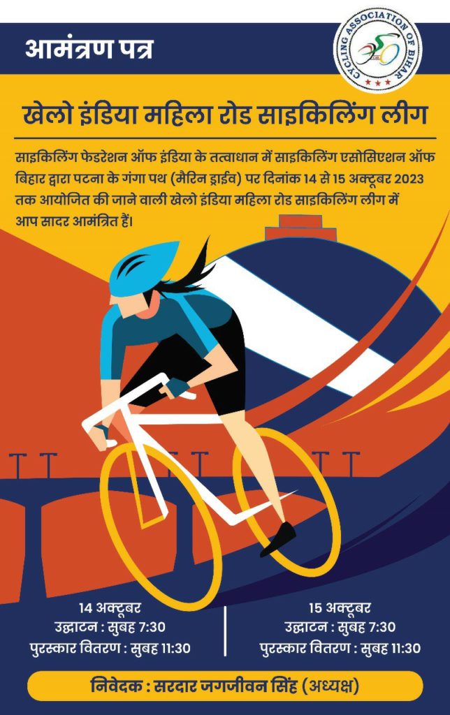 पटना के गंगा पथ पर 14 से 15 अक्टूबर 2023 तक साइकिलिंग एसोसिएशन ऑफ बिहार की ओर से खेलो इंडिया महिला रोड साइकिलिंग लीग का आयोजन किया जा रहा है।