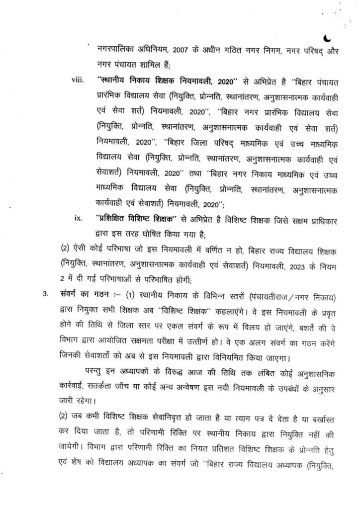 राज्य के सभी प्रारंभिक माध्यमिक एवं उच्च माध्यमिक विद्यालयों में कार्यरत 4 लाख नियोजित शिक्षकों को राज्य कर्मी का दर्जा मिलेगा। यह विशिष्ट शिक्षक कहलाएंगे। इन्हें बढ़े हुए वेतन के साथ-साथ प्रोन्नति भी मिलेगी और हस्तांतरण की सुविधा भी । लेकिन राज्य कर्मी का दर्जा पाने के लिए शिक्षकों को परीक्षा पास करनी होगी। इसके लिए सरकार द्वारा सक्षमता परीक्षा ली जाएगी। परीक्षा को पास करने के लिए तीन मौके दिए जाएंगे। तीसरे प्रयास में भी असफल रहे शिक्षकों को सेवा से हटा दिया जाएगा । इससे संबंधित शिक्षा विभाग ने बिहार विद्यालय विशिष्ट शिक्षक नियमावली 2023 तैयार की है। इसके प्रारूप को वेबसाइट पर जारी किया गया है। सप्ताह भर में इस नियमावली के प्रारूप पर सुझाव मांगा है।