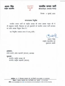 रांची – भाजपा राष्ट्रीय पदाधिकारियों की नव नियुक्ति पर पदाधिकारियों को प्रदेश भाजपा ने बधाई एवम शुभकामनाएं दी हैं। प्रदेश अध्यक्ष एवम पूर्व मुख्यमंत्री बाबूलाल