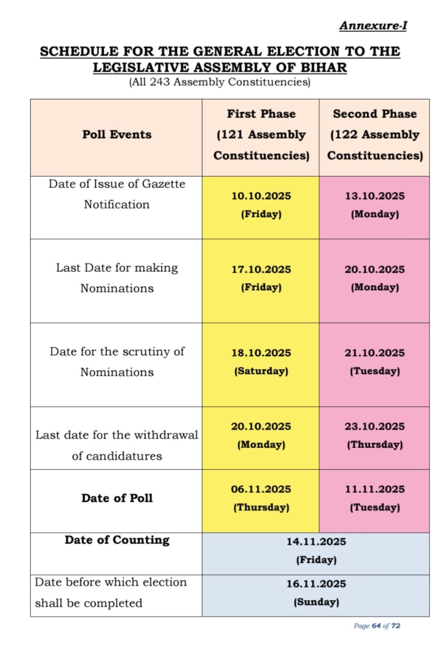 बिहार विधानसभा चुनाव 2025 : दो चरणों में मतदान, 14 नवंबर को होगी मतगणना