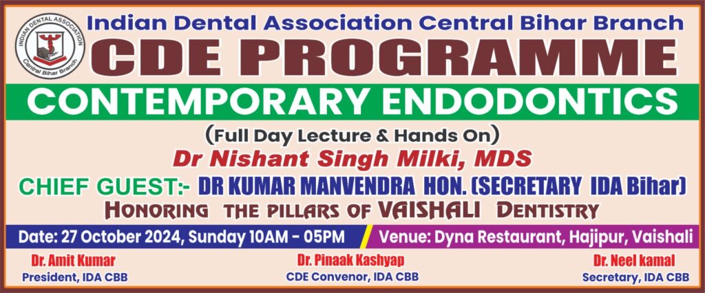 Hajipur – सेन्ट्रल बिहार ब्रांच के अध्यक्ष डॉ अमित कुमार, सचिव डॉक्टर नीलकमल ने बताया कि कल हाजीपुर में रूट कैनाल उपचार पर एक सेमिनार का आयोजन किया गया है। दंत चिकित्सा विज्ञान में भी नये नये अनुसंधान हो रहे हैं एवं आधुनिक मशीनों का प्रयोग बढ़ रहा है। कल रविवार को हाजीपुर के निजी होटल के सभागार में दंत चिकित्सा पर शैक्षणिक कार्यक्रम का आयोजन किया गया है , कार्यक्रम में रूट कैनाल उपचार के नए-नए विधियों के बारे में चर्चा होगी।