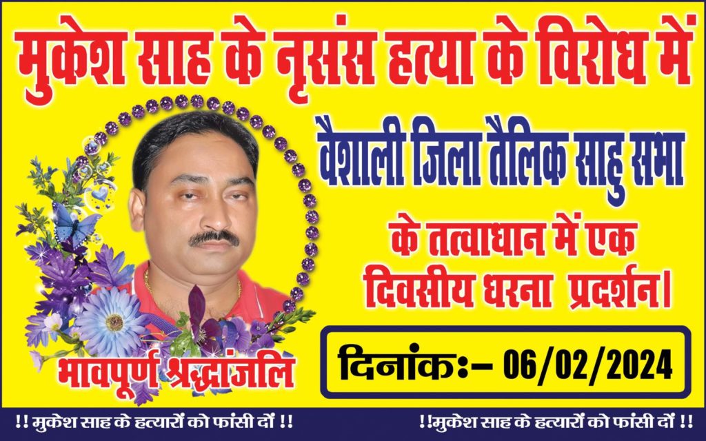 सुनील साह राजेंद्र साह, अरुण साह, मुखिया जी, चंदू साह, बच्चा बाबू जी ,रामेश्वर साह, संतोष स्वराज ,राजीव साह, आशीष कुमार लालू ने अपनी बात रखते हुए कहा कि अगर अपराधियों की गिरफ्तारी नहीं होती है तो हम लोग वैशाली जिला बंद करने का आह्वान करने को विवश होंगे। इस आंदोलन को और उग्र रूप दिया जाएगा इसके लिए वैशाली जिला प्रशासन जिम्मेदार होगी।