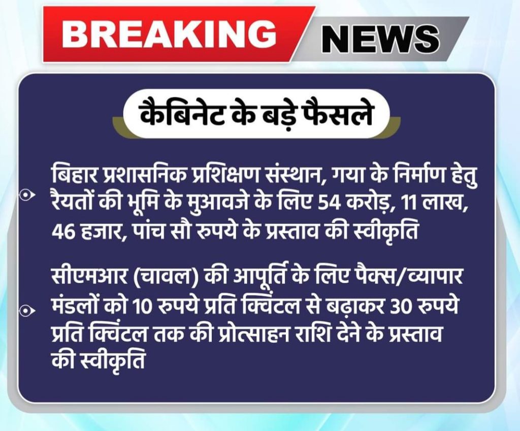 पटना-कैबिनेट बैठक: नीतीश कैबिनेट की बैठक खत्म हो गई है। नीतीश कैबिनेट ने कुल 14 एजेंडा पर मुहर लगाई है।