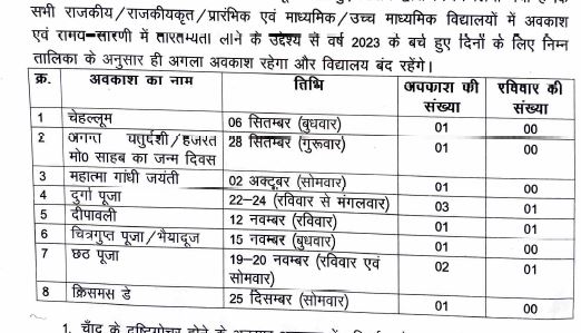 पटना- बिहार सरकार ने सरकारी स्कूलों के लिए 2023 में आने वाले पर्व त्यौहार की छुट्टियों की घोषणा कर दी है आईए जानते हैं कब